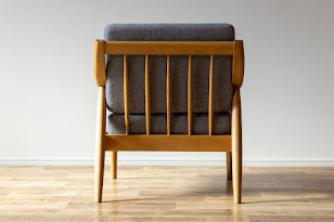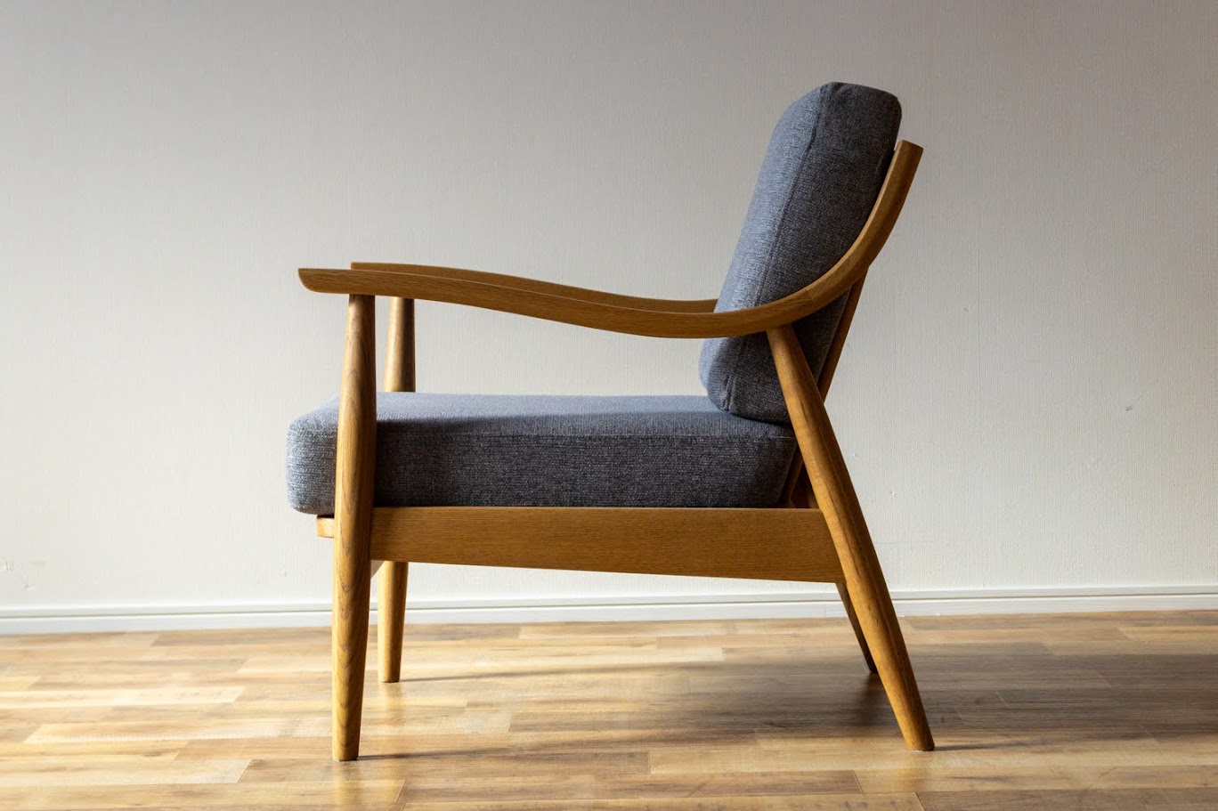 肘を置いた際にフィットするよう計算された、流れるような曲線が美しいウッドフレームのソファ。