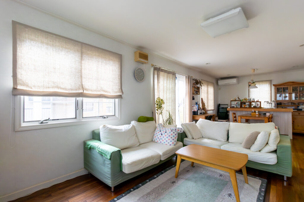 窓4面(掃き出し窓1面+腰窓3面)に導入されたリネンカーテンとシェード。「生成りの色だから以前より暗くなるかなと思ったんですが、光の入り方が柔らかくて快適。風通しもよく、外からの視線も気になりません」