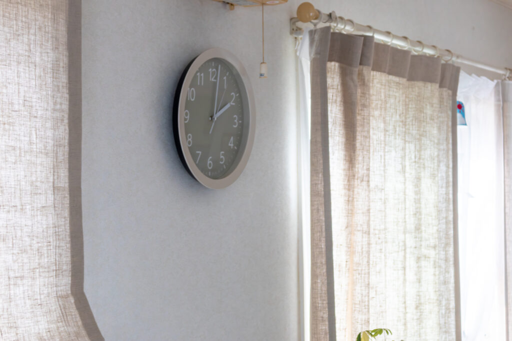 「カーテンを替えたら、時計もナチュラルカラーに。次はソファーも揃えたいと考えています」リネンカーテンが暮らしの基準となり、少しずつインテリア全体の方向性が整っていく。その変化を楽しんでいるといいます。