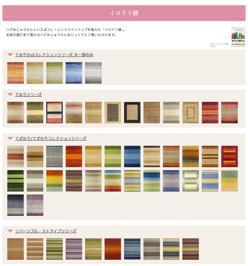 ハグみじゅうたん展は限定のておりシリーズや、てざわりCOLLECTIONシリーズ全柄がご覧いただける特別なイベントです。- 購入前に実物を見たい
