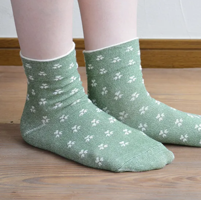 履き口を締め付けない、生地全体に伸縮の糸を入れて足をまるごとやさしく包みこむソックスです。可愛いらしい柄と落ち着いたカラーは、履くだけで癒されること間違いなしです。