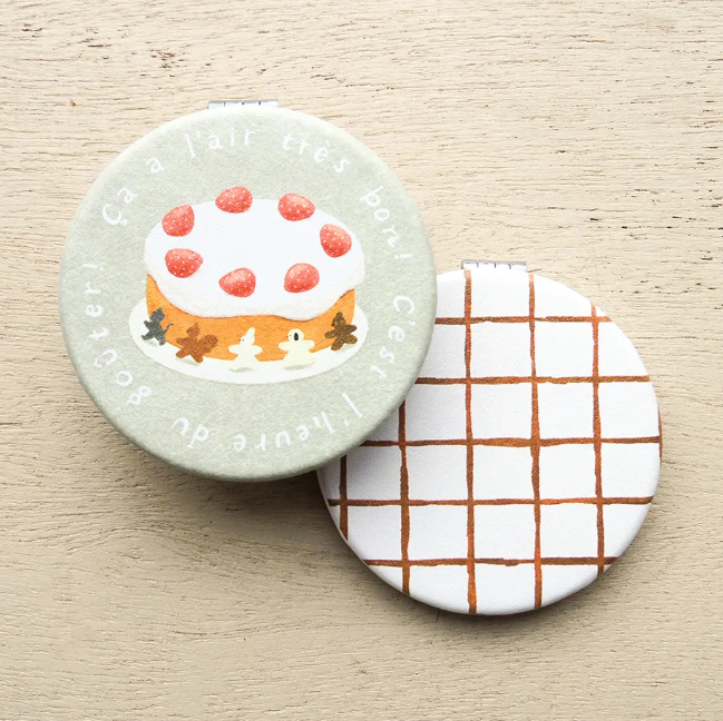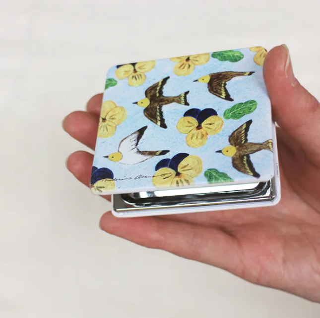 てのひらサイズのかわいいコンパクトミラー。両面に柄が入っていて、ポーチにも入りやすいサイズです。