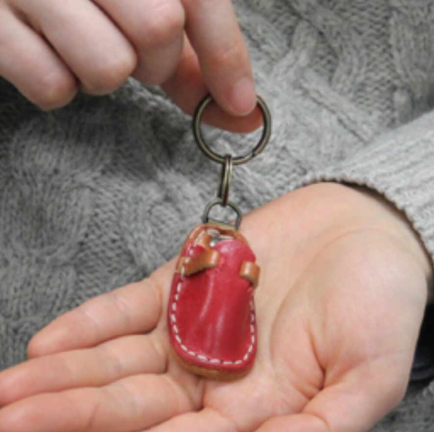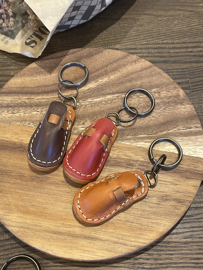革製品の象徴ともいえるサボサンダルをミニチュアサイズで表現した、遊び心あふれるデザインです。