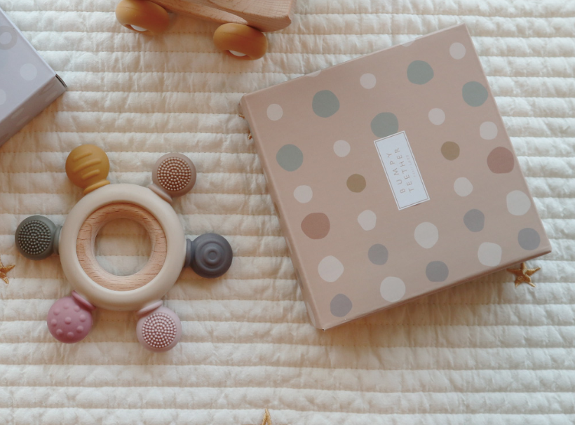 触感・形・色合いで五感を刺激し、楽しく遊びながら歯ぐずりの解消や噛む練習、顎や歯の成長を促すことが期待できる楽しい歯固めです。