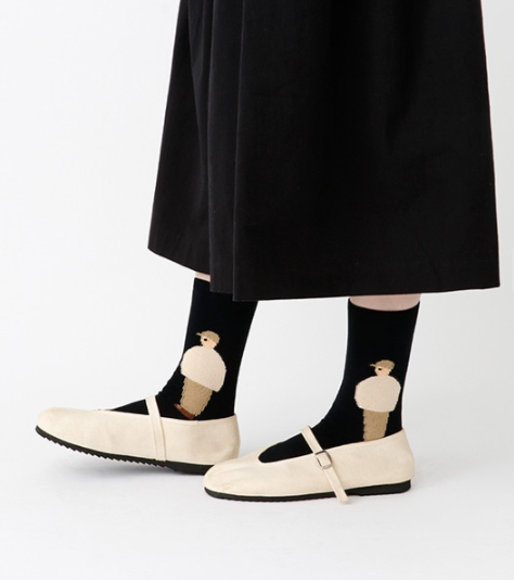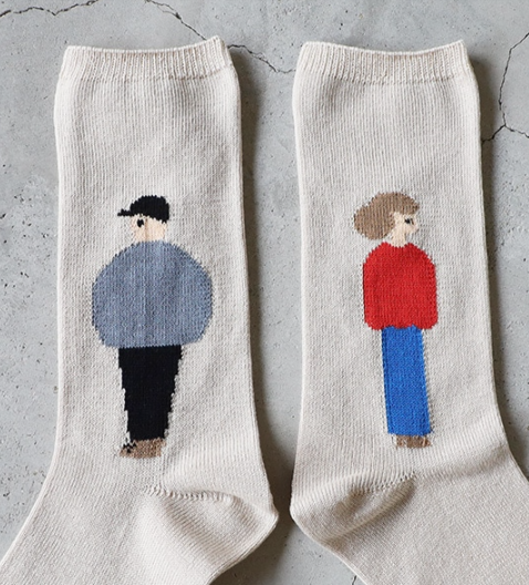 女の子と男の子がモチーフで、左右で柄が変わる楽しいソックスです。